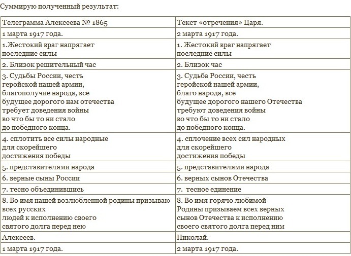Несколько замечаний по «Манифесту об отречении Николая II» Официальная версия отречения прописана детально. Многочисленные мемуары очевидцев, дым газетных репортажей и скупые строки дневника Императора — фрагментами мозаики легли в общую картину; свидетельства думских заговорщиков сплелись в причудливую вязь с показаниями заговорщиков Свиты. Согласно их обобщённой версии, 28-го февраля Царь выехал из Ставки в Царское Село, но был остановлен на пути следования сообщениями о безпорядках в Любани и Тосно. Развернув поезда, Государь приказал объехать бунтующий участок через ст. Дно и Псков на Царское. Но во Пскове Николаю II передали телеграммы командующих с мольбами об отречении, после чего Царь отрёкся, подписав два соответствующих манифеста. Такова официальная версия. Концы интриги спрятаны надёжно, факты предательства тщательно затушёваны. Клятвопреступления вообще как бы не было — ведь Государь отрёкся Сам. Тем не менее, факт заговора особо не скрывается даже его участниками. Но в чём же заключался заговор, если наличествует своей рукой подписанное отречение, если власть, добровольно или вынужденно, но СОБСТВЕННОРУЧНО была передана заговорщикам? На этот вопрос я попробую найти ответ. К сожалению, не приходится рассчитывать на помощь верных Государю людей — среди окружавших Его очевидцев верных Царю не нашлось. «Кругом измена и трусость и обман!» Это ничего. Нам помогут «очевидцы» другого рода, долго молчавшие посреди лгавших нам людей, и донесшие до нас их тайны и измены. Это пожелтевшие в архивах листы экземпляров «отречения». Вот они: ![]() ![]() Поглядим внимательно на эти бумаги. Неспешный их анализ поведает пытливому человеку многое. К примеру, всем изследователям бросается в глаза то, что подписи Государя сделаны карандашом. Удивлённые историки пишут, что за 23 года правления то был единственный раз, когда Государь поставил на документе карандашную подпись. Целиком разделяя их удивление, шагнем, однако, немного дальше, и проверим аутентичность самих подписей Царя и Фредерикса, оценим структуру текста «отречения» и установим его авторов, посчитаем буквы в тексте и уточним количество известных экземпляров «отречений». 1. Кто автор текста «отречения». Телеграмма Алексеева № 1865. Кто же сочинил «отречение» Государя? Сам Государь. Так, по крайней мере, следует из свидетельских показаний. Согласно им, Императору предлагались «наброски» отречений, которыми Он не воспользовался. Вот что в точности пишет очевидец Шульгин: «Государь ответил. После взволнованных слов А.И. (Гучкова — Р.) голос Его звучал спокойно, просто и точно. Только акцент был немножко чужой — гвардейский: — Я принял решение отречься от престола... Государь встал... Все поднялись... Гучков передал Государю «набросок» (отречения — Р.). Государь взял его и вышел.Через некоторое время Государь вошел снова. Он протянул Гучкову бумагу, сказав: — Вот текст... Это были две или три четвертушки — такие, какие, очевидно, употреблялись в Ставке для телеграфных бланков. Но текст был написан на пишущей машинке. Текст был написан теми удивительными словами, которые теперь все знают... Каким жалким показался мне набросок, который мы привезли. Государь принес и его и положил на стол. К тексту отречения нечего было прибавить...» Шульгин В.В. «Дни». (Все многоточия — авторские. Р.) Ем